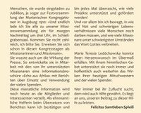 Eingedenk der erschwerten Lebenssituation in der gegenwärtigen Krise kann der Ausspruch unserer seligen Mutter Gründerin, Maria Theresia Ledochowska, der sie bei Hindernissen nicht aufgeben liess, auch Ansporn sein: „Immer heiter, Gott hilft weiter!“