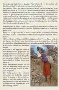Mönch, Missionar, Priester *1580 in Verdú, Spanien Pedro Claver trat im Alter von 22 Jahren in den Jesuiten-Orden ein. Er studierte Philosophie an der Missionsschule in Mallorca, wo ihn der Pförtner Alonso Rodriguez für die Missionarbeit begeistern konnte. Pedro ging zunächst nach Westindien, dann nach Santa Fe bei Bogota, schliesslich nach Cartagena in Kolumbien, wo er zum Priester geweiht wurde. Cartagena war Zentrum des Handels mit Sklaven aus Afrika. 38 Jahre brachte er mit unermüdlicher Hilfe für diese Sklaven zu., wirkte vor allem auch in der medizinischen Versorgung und als Lehrer, er nannte sich selbst "Sklave der Sklaven". Man sagt, er habe mehr als 300.000 Menschen getauft, schon zu Lebzeiten nannte man ihn den "Apostel der Neger." Aus diesen Gründen haben wir ihn als Patron für unsere Schwesternschaft gewählt. Kanonisation: Papst Leo XIII. sprach Pedro Claver 1888 heilig und ernannte ihn 1896 zum Patron der "Mission unter Negern". Patron von Kolumbien. |